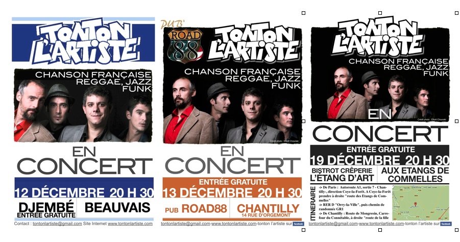 Merci à tous les lieux qui nous ont diffusés cette année, je pense particulièrement à Dame Juliette (www.damejuliette.com) & au Pub Le Road 88 à Chantilly, au Bar le Djembé (https://www.facebook.com/jaja.ledjembe), au VandB (https://www.facebook.com/VandB.Beauvais) à Beauvais, à L’étang d’art de Coye La Foret (http://www.l-etangdart.fr) … Merci de diffuser de la composition originale et de permettre à tonton l’artiste d’exister.