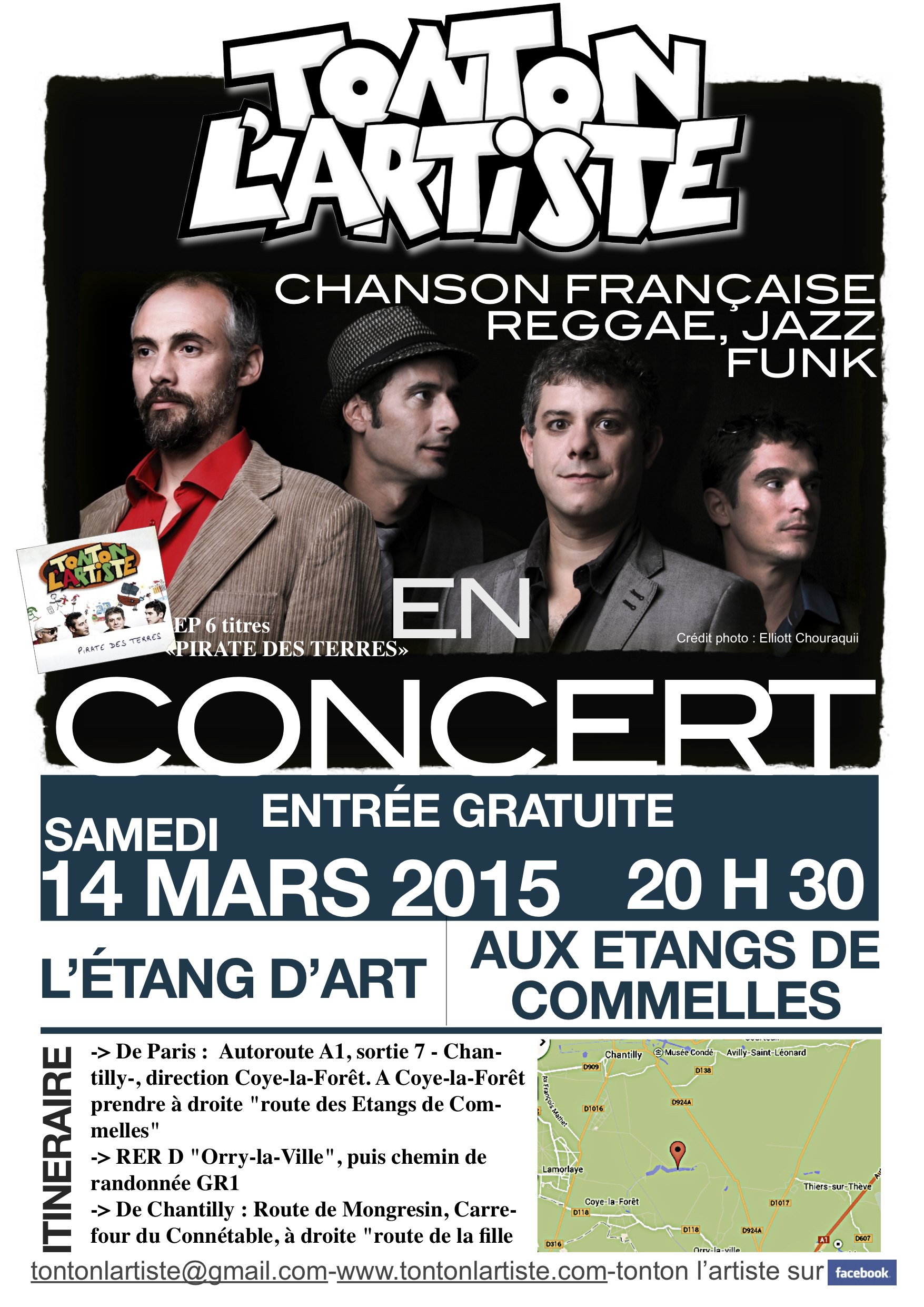 Oyez, Oyez, ce samedi 14 mars 2015 au bistrot crêperie l’étang d’art (situé aux étangs de Comelle, près de Chantilly), tonton l’artiste a le plaisir de vous convier à une soirée concert placée sous le signe de la chanson française, du reggae du jazz et de la bonne humeur.